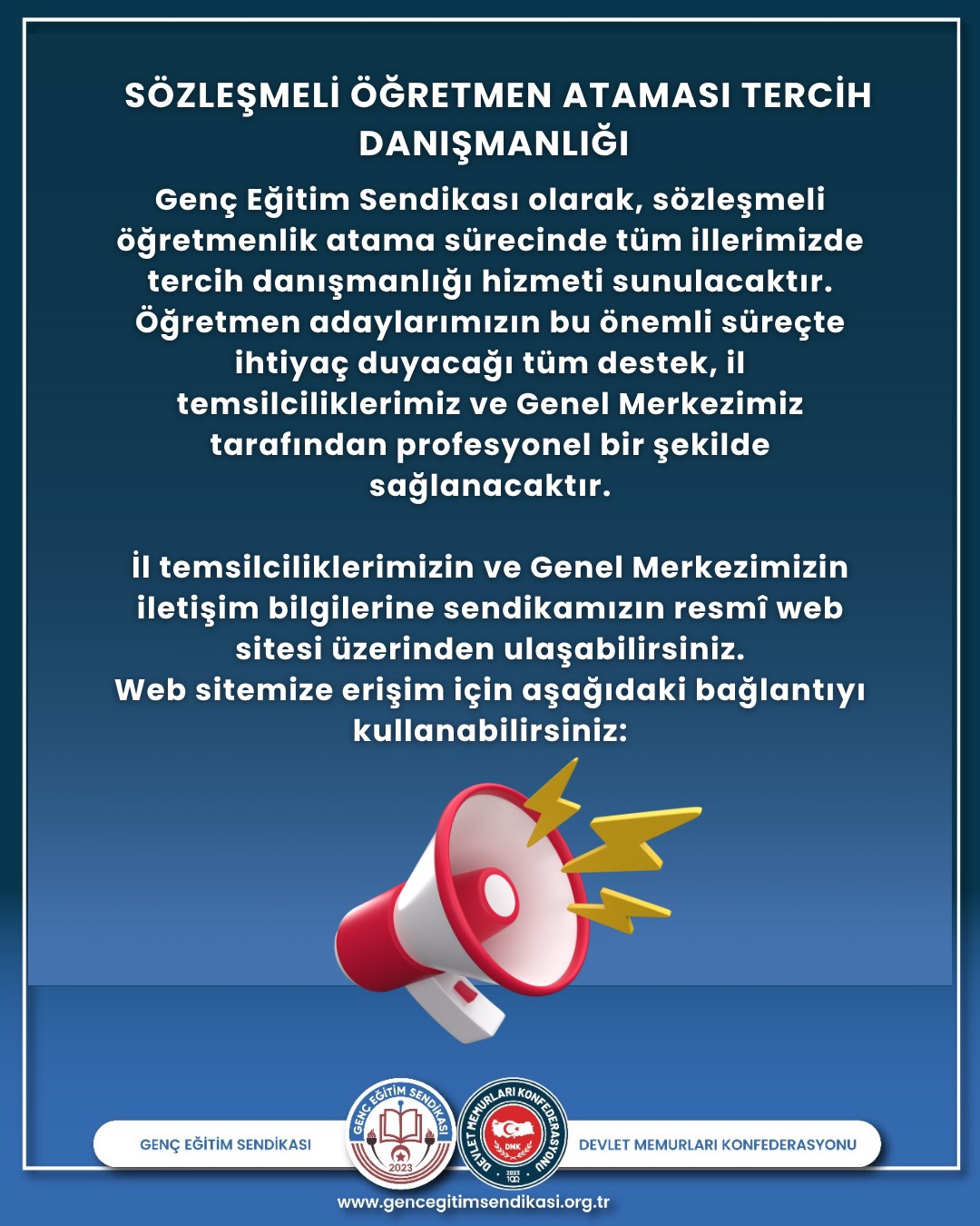 Sözleşmeli Öğretmenlik Ataması Tercih Danışmanlığımız Başladı. Genç Eğitim Sendikası olarak tüm illerimizde tercih danışmanlığı hizmeti sunulucaktır.