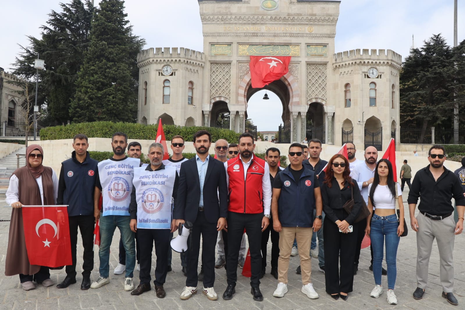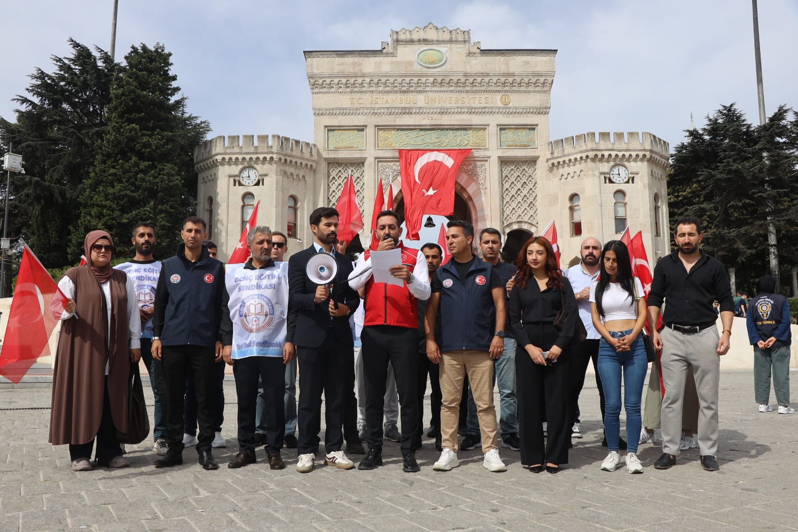 Genç Eğitim Sendikası ve Devlet Memurları Konfederasyonu olarak İstanbul Üniversitesi önünde Genel Başkanımız Mehmet Fatih Arslan, Devlet Memurları Konfederasyonu İl Başkanı ve Genç Sağlık Sendikası İstanbul 1 Nolu Şube Başkanı Orhan Oktar, İstanbul Avrupa Şube İl Başkanımız Mehmet Ramazan Turan, İstanbul Anadolu Şube İl Başkanımız Doğan Özpolat, Ankara İl Başkanımız Erhan Yıldız, Koruma ve Güvenlik Komisyonu Başkanımız Cihat Kuru, İstanbul Avrupa Şube İl Başkan Yardımcısı Emrah Sözüer, İstanbul Üniversitesi Temsilcimiz Zübeyde Arslan, Koruma ve Güvenlik Memuru üyelerimiz ve Sendika Avukatımız Öykü Hazal Uçma'nın katılımlarıyla İstanbul Üniversitesi'ndeki keyfi uygulamalara karşı basın açıklamamızı gerçekleştirdik.