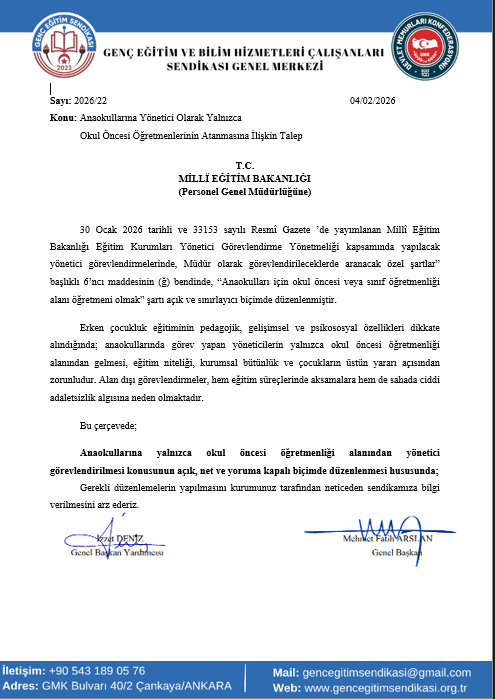 Bilindiği üzere sendikamız tarafından 04/02/2026 tarihli ve 2026/22 sayılı resmi yazı ile Millî Eğitim Bakanlığı Personel Genel Müdürlüğüne başvuruda bulunularak; anaokullarına yönetici görevlendirmelerinde alan dışı atamaların tamamen kaldırılması ve bu kurumlara yalnızca okul öncesi öğretmenliği alanından yönetici görevlendirilmesi yönünde açık, net ve yoruma kapalı bir düzenleme yapılması talep edilmiştir.