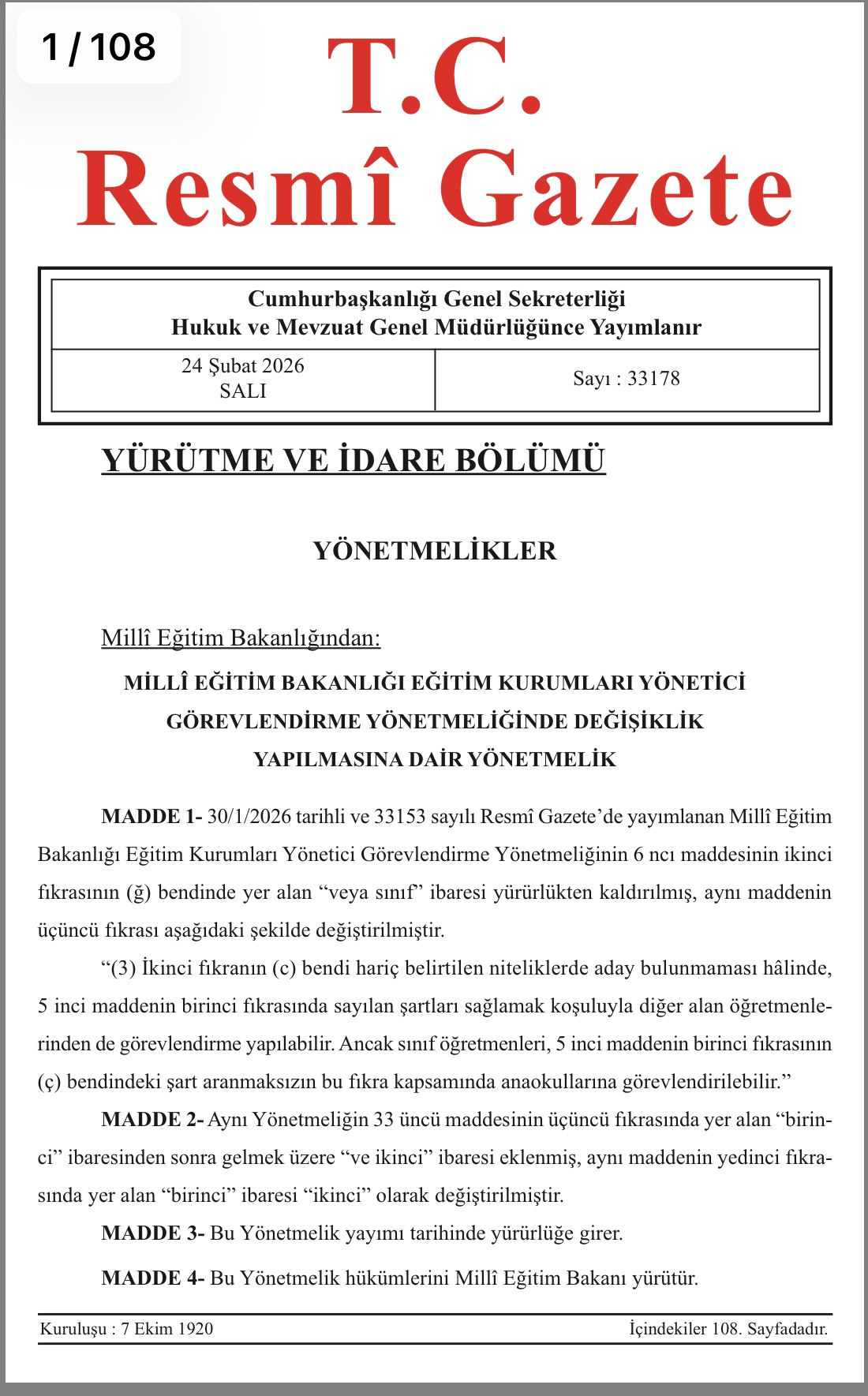 Millî Eğitim Bakanlığı tarafından hazırlanan ve 30 Ocak 2026 tarihli, 33153 sayılı Resmî Gazete’de yayımlanarak yürürlüğe giren “Millî Eğitim Bakanlığı Eğitim Kurumları Yönetici Görevlendirme Yönetmeliğinde Değişiklik Yapılmasına Dair Yönetmelik”, anaokullarına yönetici görevlendirilmesi hususunda sahada uzun süredir devam eden bir tartışmayı yeniden gündeme taşımıştır.